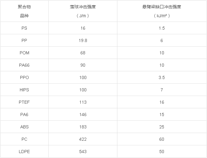 ????????不同塑料的沖擊強(qiáng)度相差很大,具體如表1和表2所示,以落球沖擊強(qiáng)度比較最大的塑料為L(zhǎng)DPE、沖擊強(qiáng)度最小的為PS,以懸臂梁缺口沖擊強(qiáng)度比較PC最大、PS最小、PPO次之。